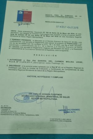 El Ministerio de Salud (Seremi Región Metropolitana) me faculta para el ejercicio de la Podología.
